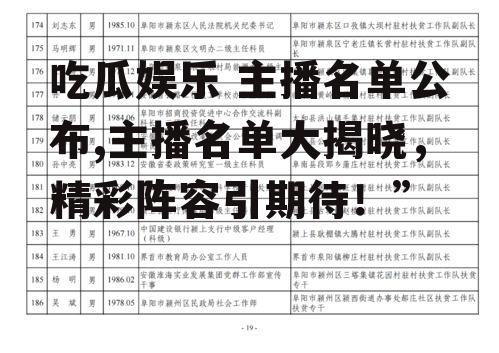 首先,让我们来一睹为快,这份备受瞩目的主播名单上都有些谁呢?据可靠消息透露,这次名单上的主播可谓是各路神仙齐聚一堂,既有颜值爆表的鲜肉小花,也有实力派的老戏骨。下面,就让我带你一一揭晓他们的名字吧!