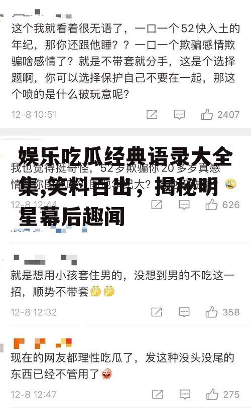 亲爱的读者们,你是不是也和我一样,闲暇之余喜欢翻翻那些让人捧腹大笑的娱乐吃瓜经典语录呢?那些或幽默、或讽刺、或深情的句子,仿佛一剂强心针,让我们在忙碌的生活中找到一丝轻松和快乐。今天,就让我带你一起走进这个充满欢乐的世界,盘点那些让人回味无穷的娱乐吃瓜经典语录大全集吧!