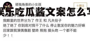写一篇好的娱乐吃瓜酱文案,需要你关注热点、抓住潮流、运用幽默的语言、丰富的内容和互动性强的表达方式。只要你用心去写,相信一定能吸引到一大批粉丝哦!快来试试吧,让我们一起在娱乐的世界里畅游吧!